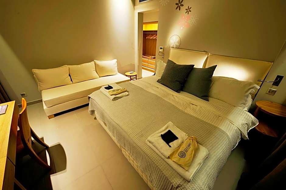 Modernly decorated suite with a private balcony. It includes: -Cocomat mattresses -satellite LCD TV -DVD player with movie selection -coffee machine with free capsules -mini-bar -modern bathroom with toiletries, plush bathrobes and hairdryer -mini aromatherapy pillows.